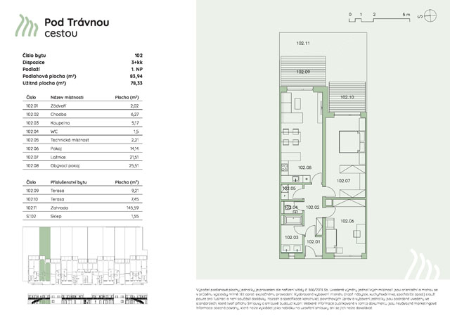 | 102 | 1. NP | 3+kk | 83,94 m2 | 16,66 m2 | 145,59 m2 | volný | 8 390 000 Kč | Rezervace |