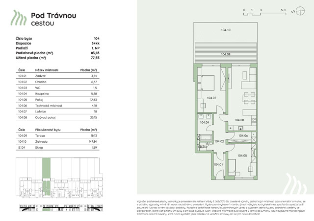 | 104 | 1. NP | 3+kk | 83,83 m2 | 18,13 m2 | 147,18 m2 | volný | 8 390 000 Kč | Rezervace |